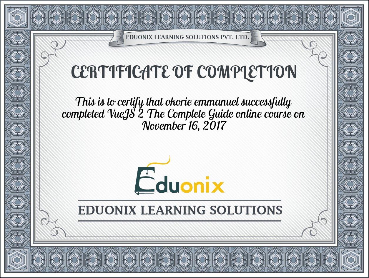Organisation: Eduonix Course page: https://www.eduonix.com/vuejs-2-the-complete-guide Download: Download Certificate ' Verify Certificate: Not Available